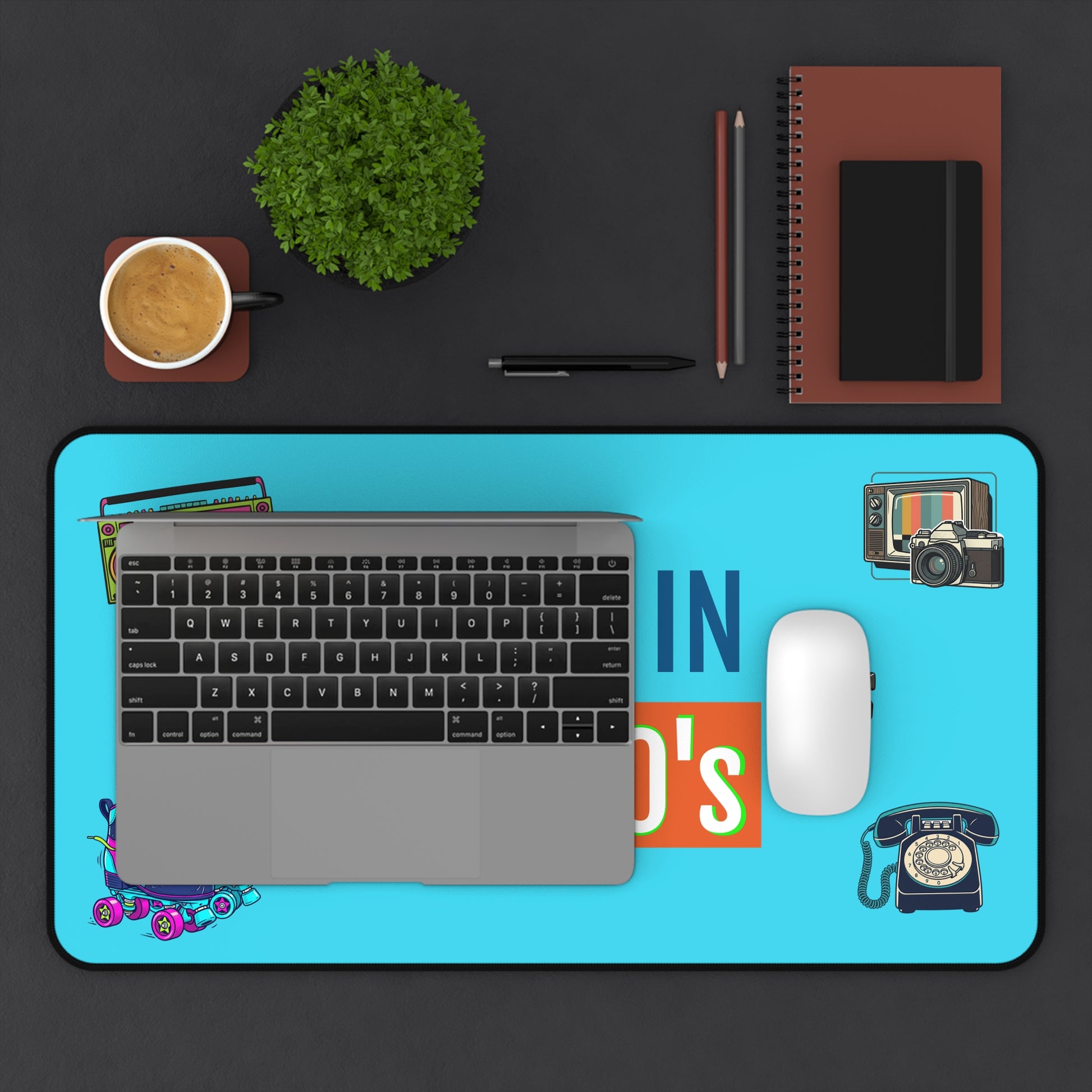 Retro 80s Desk Mat — Vintage Roller Skates, Boombox & Polaroid Design